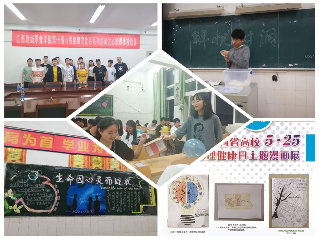 活动月期间,心理中心紧紧围绕“育新人?育人心”这个主题组织开展了丰富多彩、灵活多样的九大系列活动,“心理漫画创作大赛”、“心理短视频创作大赛” 和“心理板报评比活动”锻炼了同学们的创作能力和实践动手能力,同时愉悦大学生身心,积极传播心理正能量;“心理博弈挑战赛”活动有助于提高同学们的语言表达能力、逻辑推理能力和心理素质;“心理健康知识竞赛”活动普及了心理健康知识、帮助同学们树立心理健康新观念、提高自我心理保健意识;“解忧树洞”班级全员心理互助活动让心理活动深入到每个班级、让每一位同学都能参与其中,彼此打开心扉,携手互助;“梦想储蓄罐”自我规划设计活动让同学们学会树立正确的目标,做好大学生活和学习规划;“心理素质拓展班级大比拼”以“心理运动会”的形式组织各班代表队参赛,锻炼同学们的团队意识、提升团队协作能力……每项活动都旨在丰富学生的生活和学习体验,促进学生重视和关注心理健康。 同学们在活动月中放松了身心、释放了压力、体验了快乐、锻炼了能力、增强了素质,为今后的学习生活储备了积极的心理正能量。同学们热情高涨地参与各项活动,涌现出一大批先进班集体及个人:18会计20班、18本科1班、18本科2班等10个班级荣获“阳光班集体”称号;18证劵与期货1班、18会计3班等14个班级获得心理素拓优秀团队奖;18会计28班张海彦等14个团体获得短视频创作大赛奖项;18会计21班何娟等20名同学分别荣获“心理健康知识竞赛”一、二、三等奖及优胜奖;18建筑工程技术2班高平等12名同学获得狼人杀心理博弈赛奖项; 18会计20班万玲云等20名同学在心理漫画创作大赛中获奖;冯晨、刘梦丹等30名同学荣获“先进工作者”和“活动积极分子”称号。