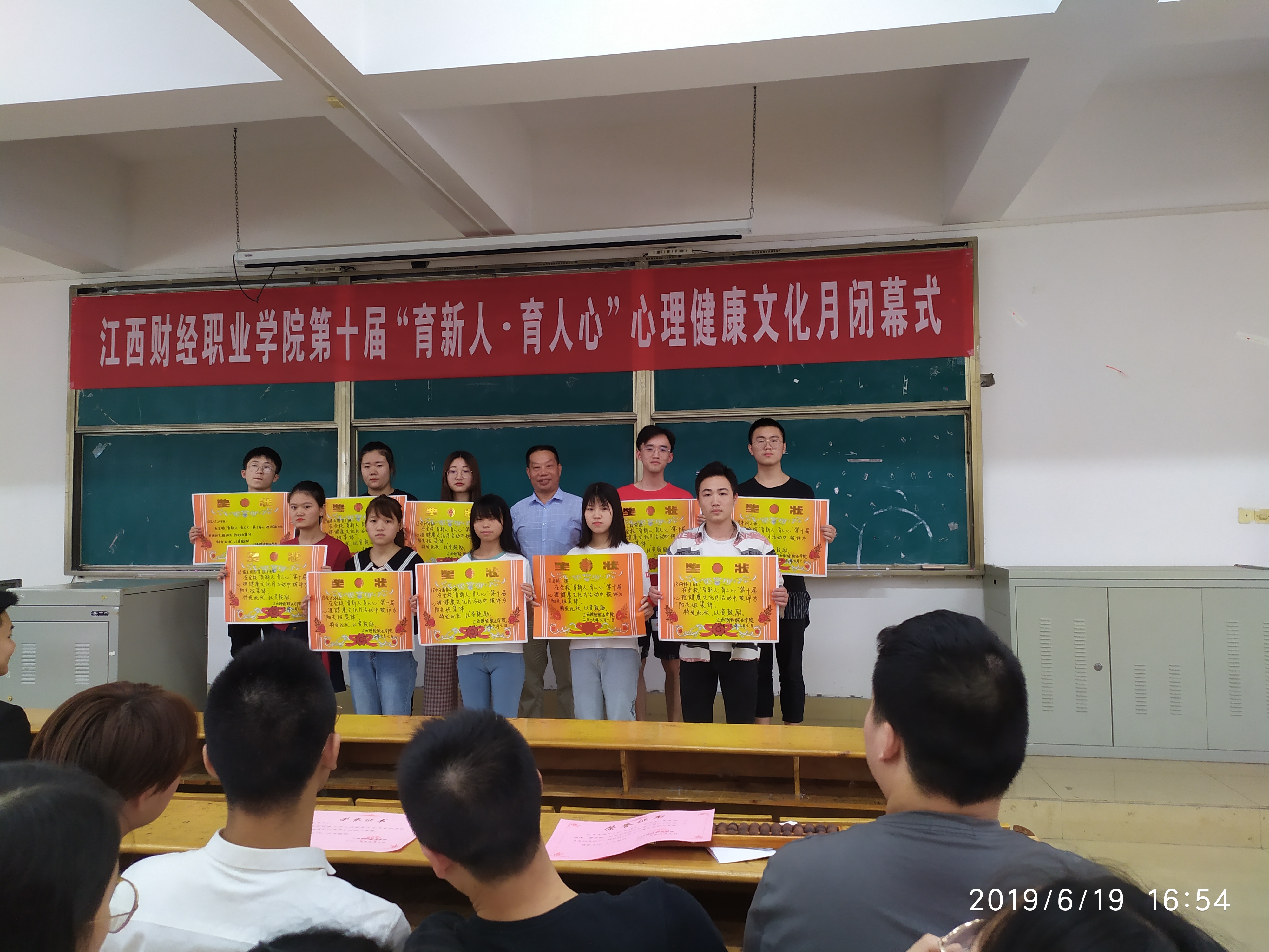 为学习贯彻习近平新时代中国特色社会主义思想及党的十九大精神,落实全国、全省高校思想政治工作会议和教育大会精神,隆重纪念五四运动100周年,中华人民共和国成立70周年,大力推进心理育人工作,2019年5月至6月中旬,我校思政部举办了以“育新人 ? 育人心”为主题的第十届心理健康文化月活动;6月19日下午,闭幕式在综合楼阶梯教室五举行,思政部负责人、心理咨询中心全体教师、大学生心理协会会员及2018级各班学生代表300余人参加。