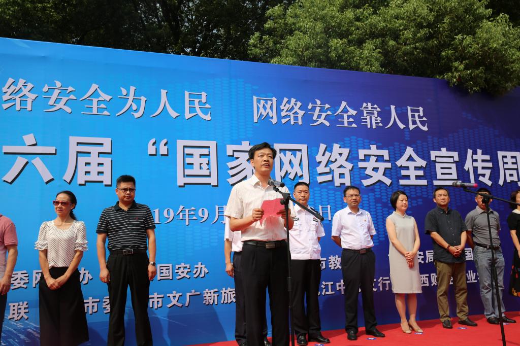 9月16日上午,九江市第六届“国家网络安全宣传周”活动启动仪式在我校东门广场举行。市委宣传部副部长代和沐出席并讲话,校党委副书记、常务副校长何先应出席仪式,市公安局、市国安局、市教育局、市工信委、市总工会、团市委、市妇联、市文广新局、人行九江中心支行等相关负责人,以及地方、企业、媒体、学生代表近300人参加,启动仪式由市网信办专职副主任欧阳小竹主持。