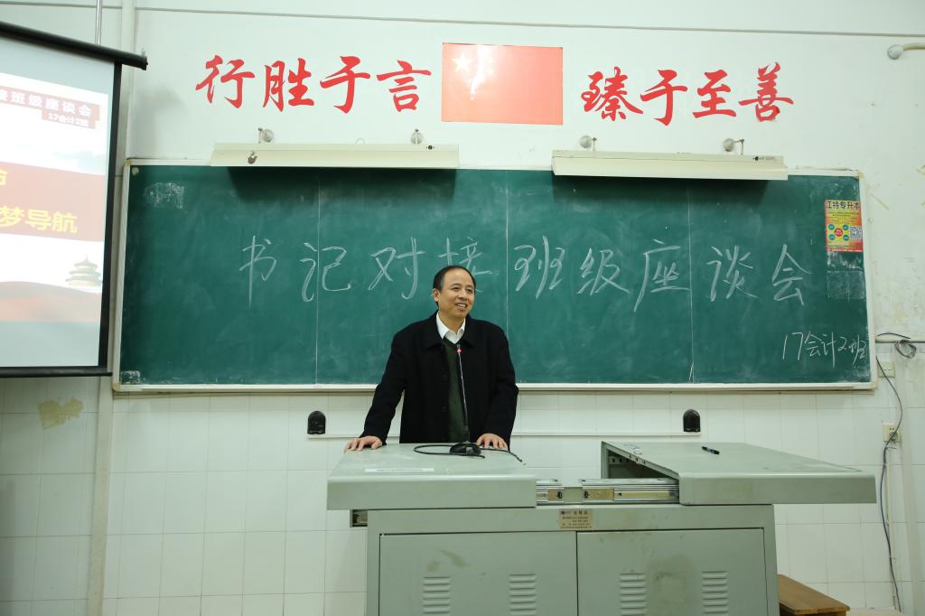 为加强思想政治工作,校党委书记林火平教授在会计第一学院党总支书记卢洪信陪同下,同所在联系点——会计第一学院2017级会计(2)班进行对接,于11月27日下午在我校教学楼315教室开展了一次“不忘初心,牢记使命,师生结对、为梦导航”主题班会。本次班会由本班班主任张庆老师主持。班会现场,林火平与联系班级全体同学“面对面”交流、“心贴心”沟通,深入了解班级工作基本情况及同学们的政治思想、学习、生活等状况,听取同学们对学校发展的意见和建议。