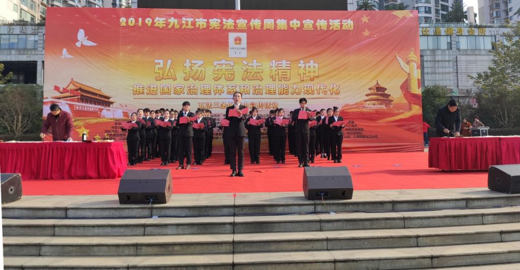 12月4日上午,由九江市依法治市办、市委宣传部、市直属机关工委、市普法办等多部门主办,我校联合参加的“12· 4”国家宪法日集中宣传活动在九江市和中广场举行。宣传统战处派出50余名志愿者参加现场宣传活动,并领诵宪法片段。