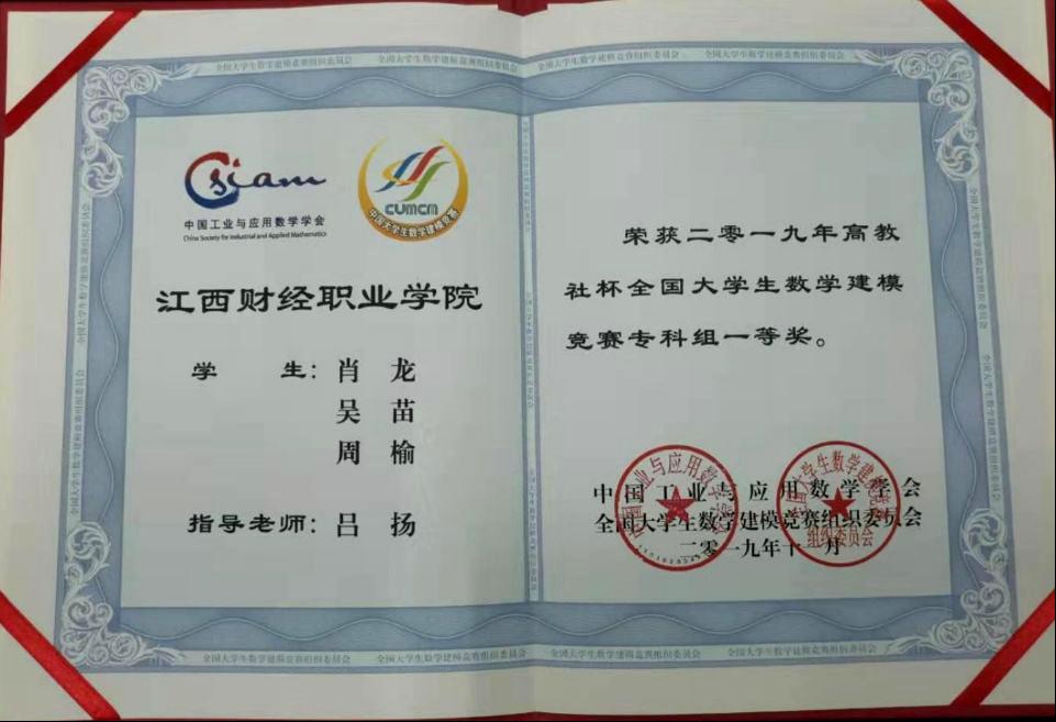 近日,2019年全国大学生数学建模竞赛获奖名单揭晓,我校18软件(1)班肖龙、18软件(2)班吴苗、18审计(1)班周榆同学组成的参赛队在基础部吕扬老师指导下荣获全国一等奖。