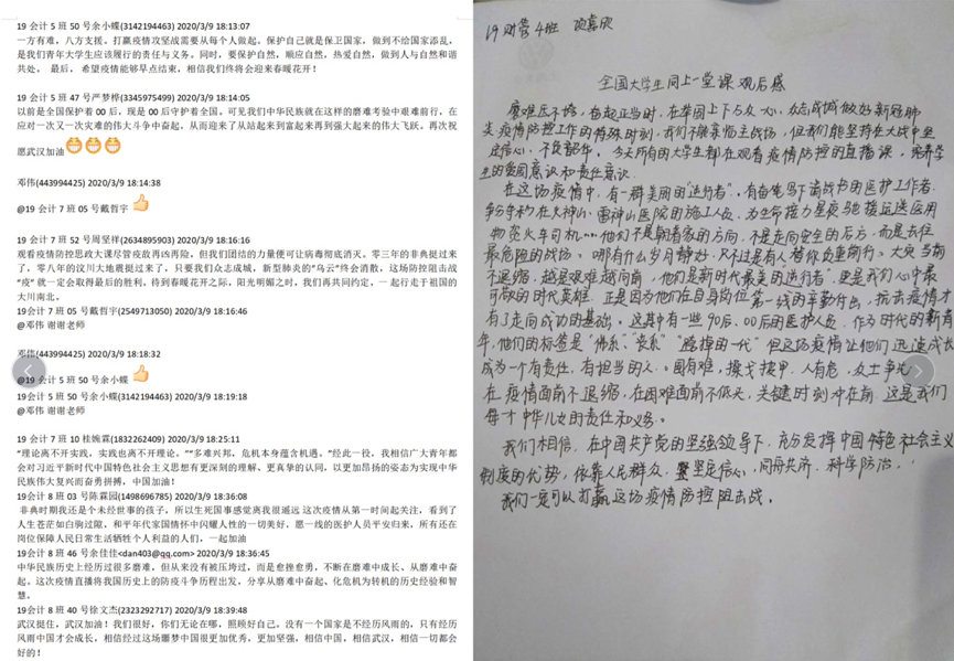 广大学生围绕战“疫”的青年担当展开了热烈讨论?;峒频谝谎г?span lang="EN-US">2017级会计21班学生朱登表示,作为一名即将毕业的学生,要把这次“大课”中的所学所得转化为为伟大祖国努力工作的动力,把抗“疫”中涌现出来的伟大奉献精神作为自己走上职场的指针。2018级网络营销班学生李浩说:“听完‘大课’后,深深认识到自己的祖国是多么的强大团结!疫情期间,我们虽然不能上战场,但我们响应号召宅在家,不给社会添乱,这也是我们的担当。”会计学2019级1班喻晶晶表示抗“疫”体现了中国特色社会主义制度的优越性,一方有难,八方支援,当武汉物资资源极其缺乏的时候,其他各省都尽其所能为武汉提供支援和帮助,在这中也看到了医护人员的伟大与他们的无私奉献,作为青年的我们应该学好自己的知识,努力奋斗成为合格的中国特色社会主义接班人。