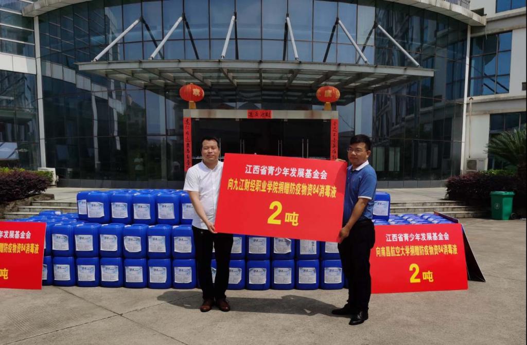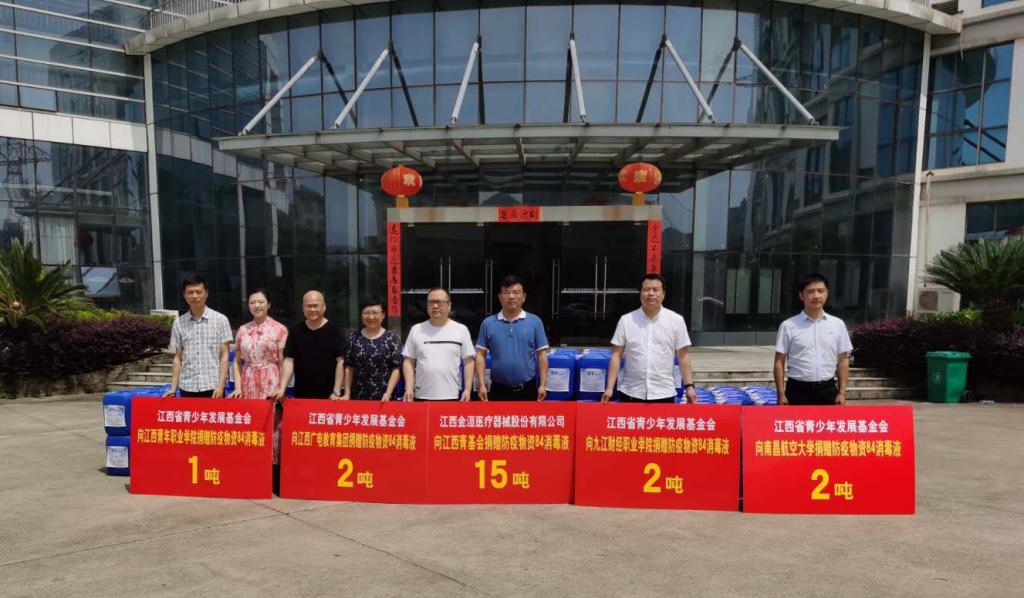 5月17日上午,在江西金洹医疗器械有限公司厂部举行了捐赠仪式。由江西金洹医疗器械有限公司向江西省青少年发展基金会捐赠防疫物资84消毒液15吨,江西省青少年发展基金会现场向南昌航空大学、江西青年职业学院、江西财经职业学院、江西广电教育集团等院校转捐1至2吨不等的84消毒液,其中我校接受捐赠84消毒液2吨。