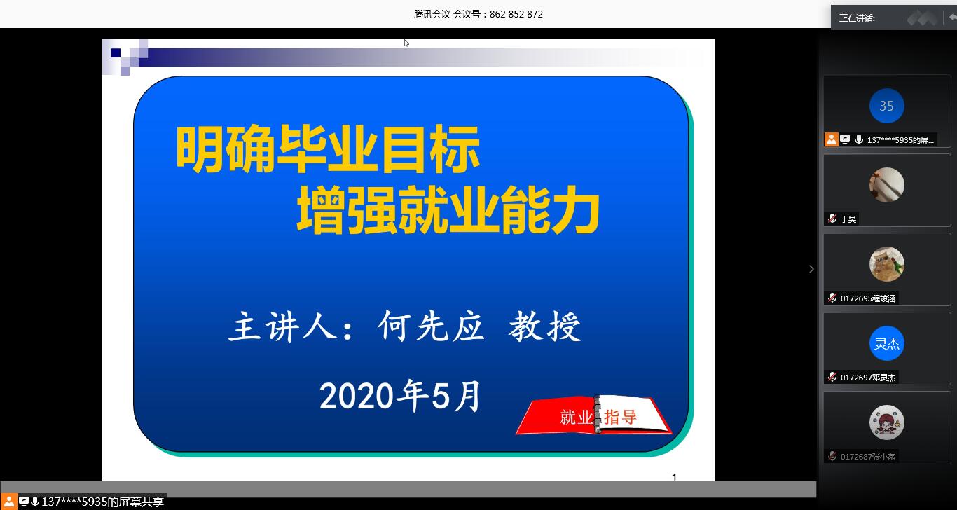为正确引导17级本科生提前树立良好的就业观,2020年5月15日,本科部邀请校党委副书记、常务副校长何先应教授通过腾讯会议平台开展了“就业指导”专题讲座,17级全体学生和部分老师参加。