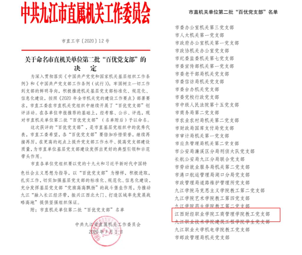 在校领导的关心和关爱下,在党校的直接指导下,7月1日,我校工商管理学院教工党支部在九江市直机关工委组织开展的“百优党支部”评选活动中脱颖而出,荣获九江市市直机关单位“百优党支部”荣誉称号。