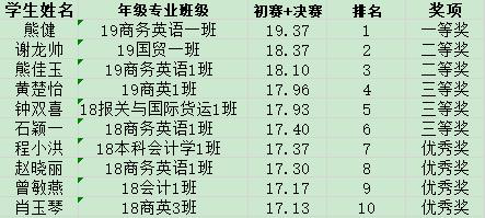 经过两个环节的角逐,公外组由来自18工商企业管理1班的杨梓鹏和19财务管理4班的刘月恒勇夺一等奖。涉外本科组的一等奖是由19商务英语1班的熊健同学获得。具体获奖名单如下。