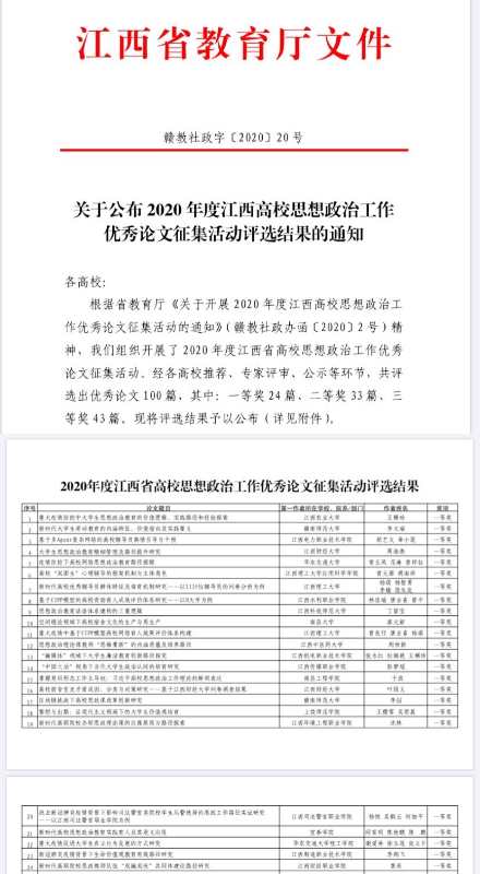近日,2020年度江西省高校思想政治工作优秀论文征集活动评选结果公布,我校教师黄亮的论文《新时代高职院校思政教师队伍“双融双优”共同体建设路径研究》荣获一等奖。