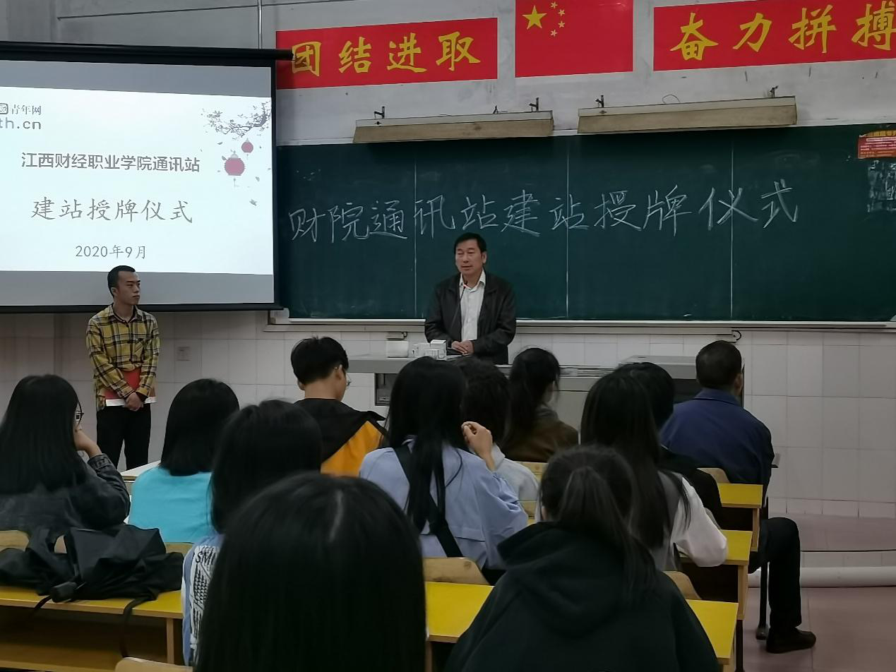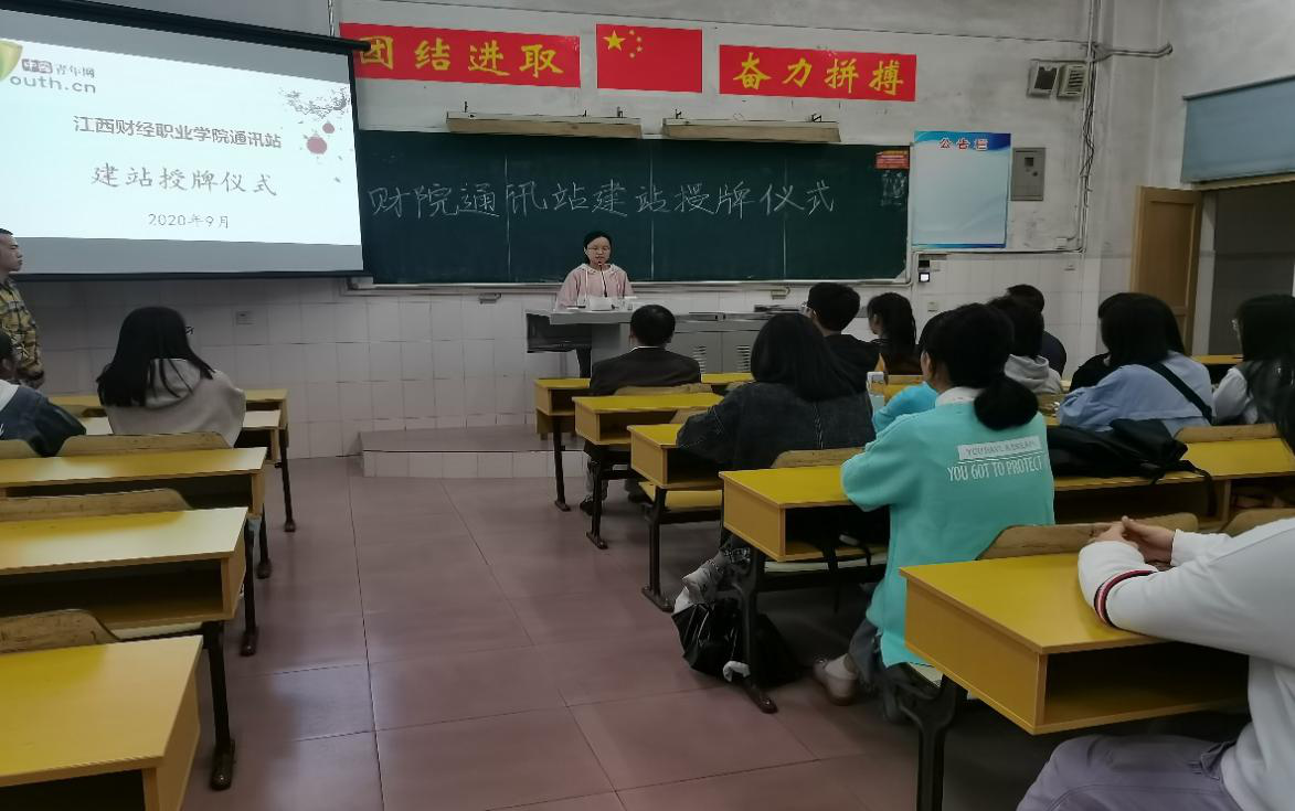 2020年9月22日,中青网江西财经职业学院建站授牌仪式在教学楼101教室隆重举行,宣传统战处、团委相关负责人、指导老师及通讯站的成员出席仪式。