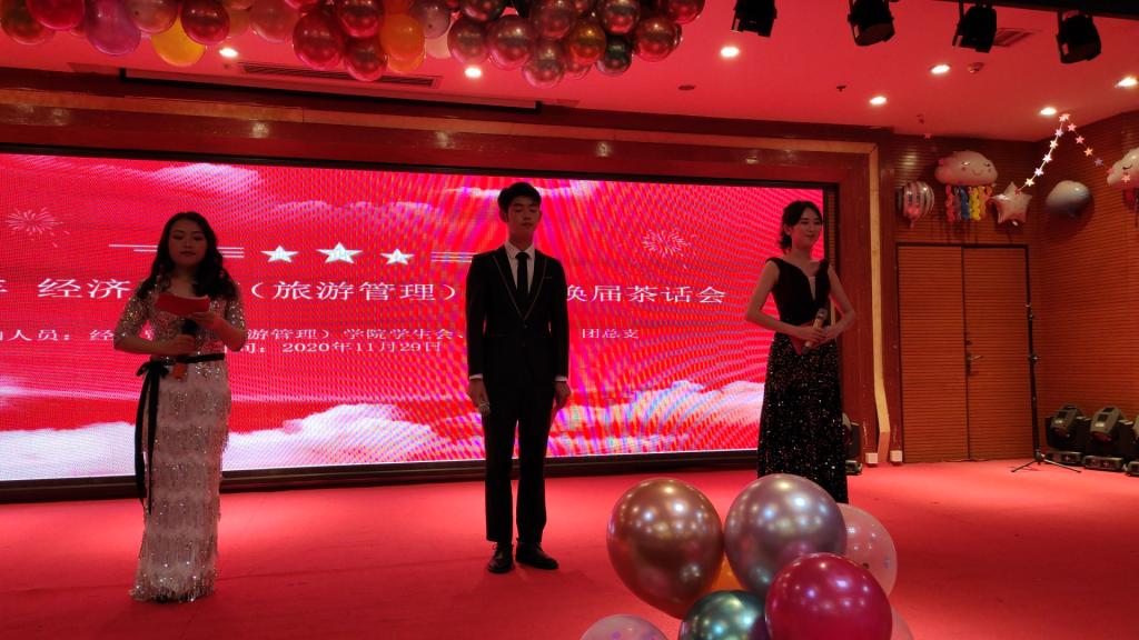 2020年12月中旬,对于经贸旅游学院学生会、电子商务协会来说是一个有着特殊意义的日子。下午5点半, 2019-2020年度学生会“愿岁月无可回顾、人生无可辜负”迎新送老换届文艺晚会如期举办,经贸旅游学院党总支书记但汉彪教授、党政办公室主任崔晓慧、团总支书记陈锦泓、办公室老师喻杨慧以及学生会、电子商务协会全体成员参加此次晚会。