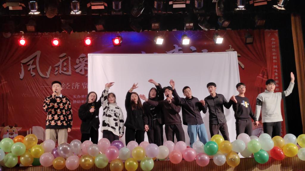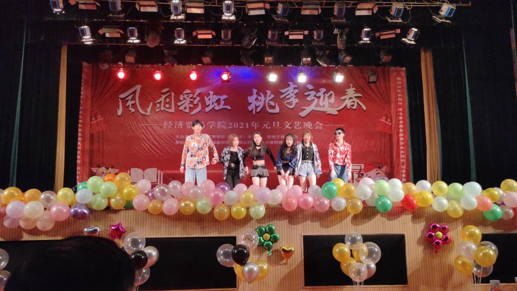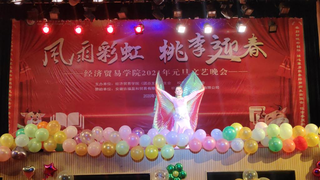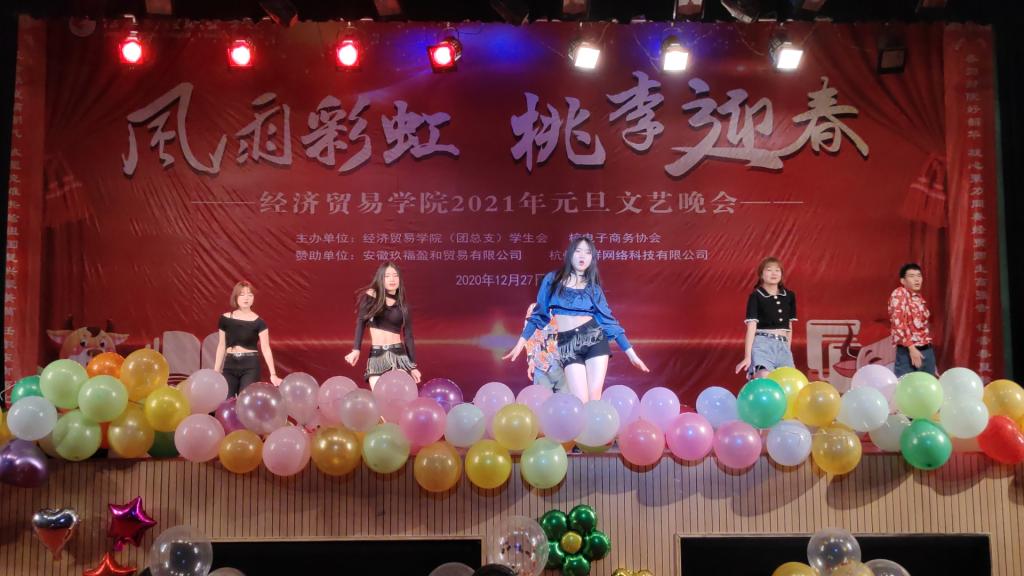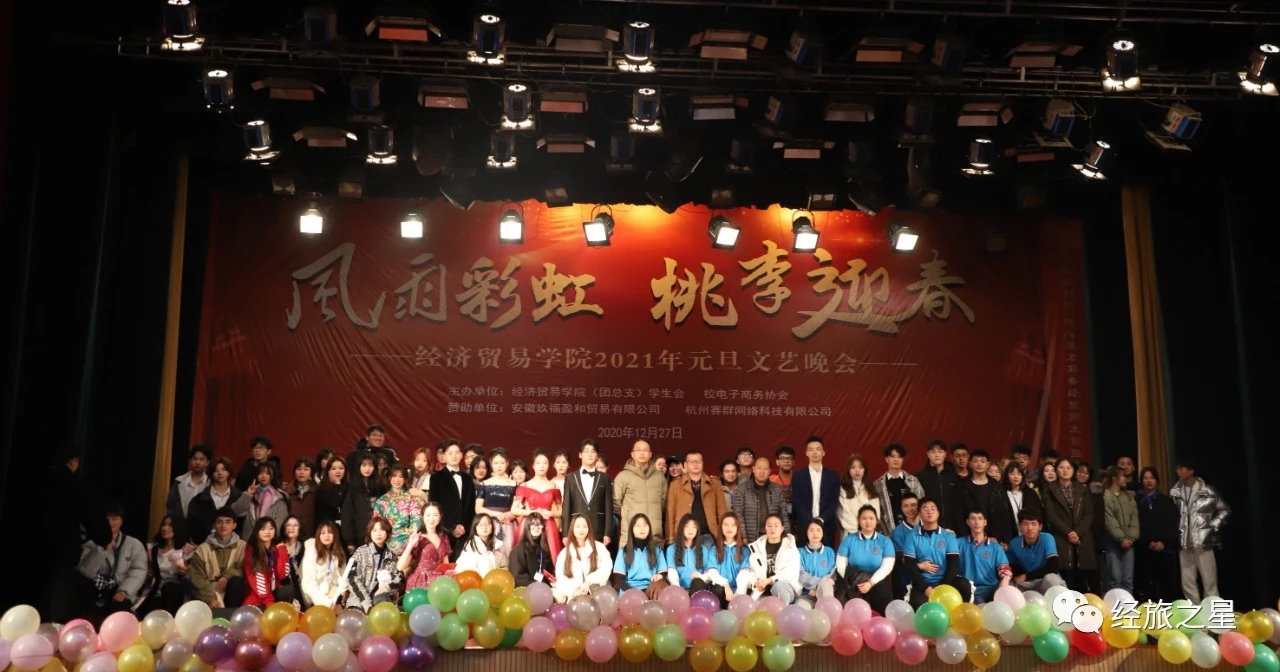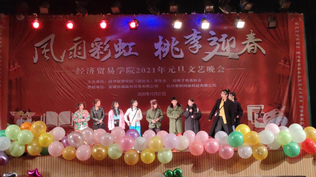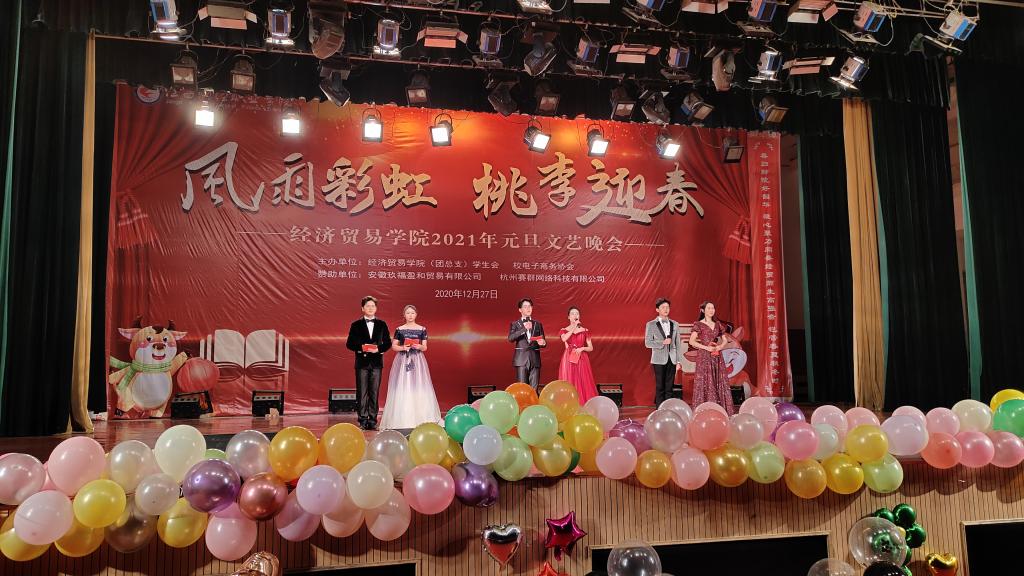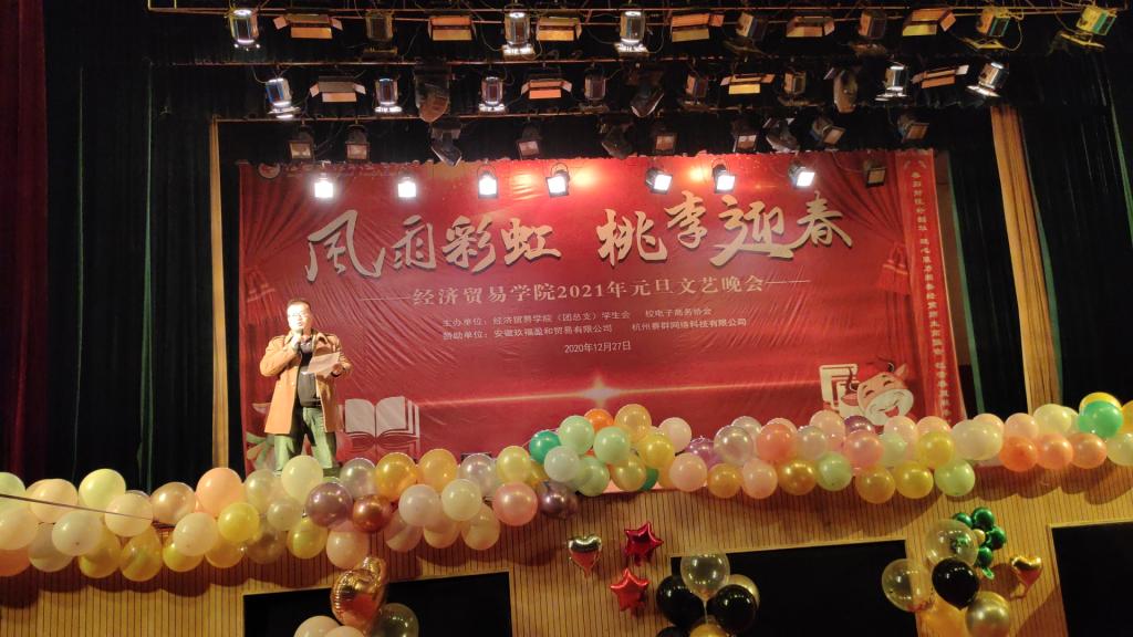 值此辞旧迎新之际,经济贸易(旅游管理)学院2021“风雨彩虹、桃李迎春”元旦文艺晚会暨优秀学生颁奖典礼于2020年12月27日晚19点在校英才交流中心隆重举行。经济贸易学院党政领导、杭州赛群网络有限公司院校负责人、以及我院师生一千余人到场观看。晚会十佳大学生奖品由安徽玖福盈和贸易有限公司赞助支持。