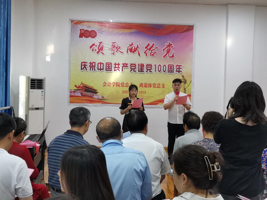 为迎接中国共产党成立100周年,歌颂党的丰功伟绩,大力弘扬红色传统、传承红色基因, 6月22日下午,会计学院党总支与离退休党总支在工会活动中心联合开展“颂歌献给党”庆祝建党100周年红歌演唱活动。会计学院党总支和离退休党总支全体党员参加活动。