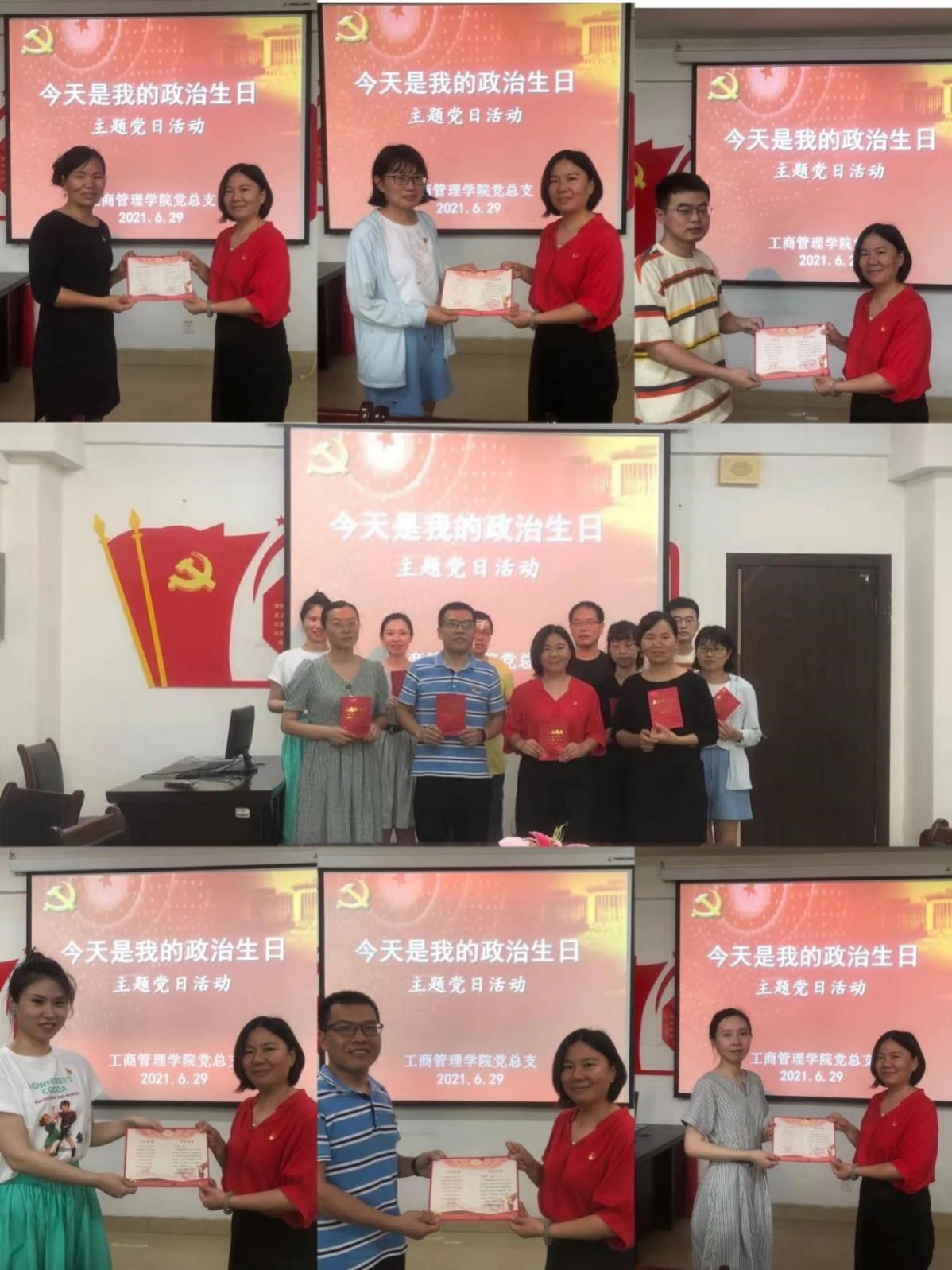 为强化党员身份认同,激发党员的党性情怀和担当意识,引导党员教师不忘入党初心,牢记立德树人的使命,体现党组织对党员的关心关爱。6月29日下午,工商管理学院党总支在综合楼903会议室开展了“今天是我的政治生日”主题党日活动,为六名上半年入党的同志集体过“政治生日”?;疃裳г旱匙苤榧俏涞ぶ鞒?,总支全体教师党员参加。