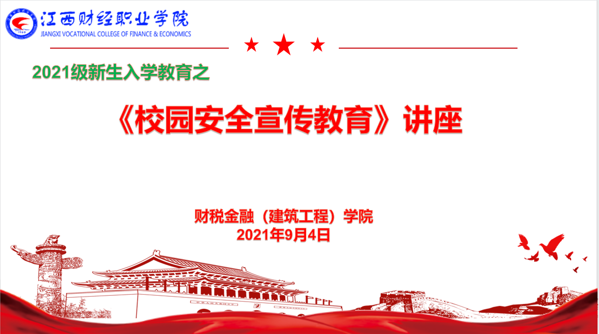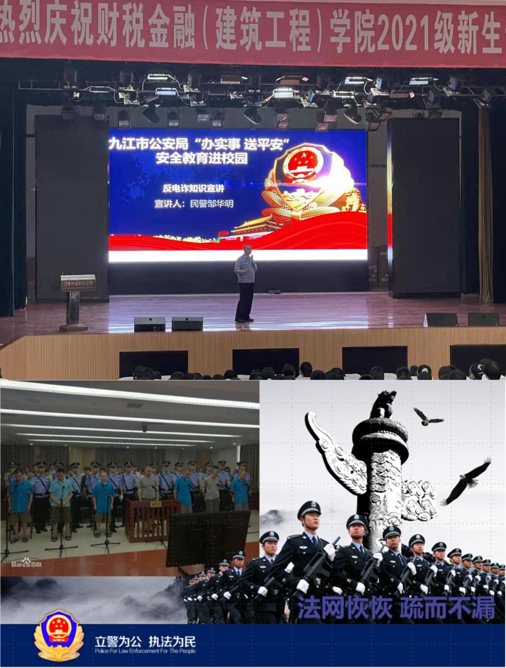 2021年9月4日上午,财税金融(建筑工程)学院在英才交流中心成功举办2021级新生入学教育系列活动之《校园安全宣传》讲座。讲座由九江市公安局浔阳区分局庐山南路派出所刑侦警察邹华明警官主讲,学院党政办公室张天明主任主持。2021级联培本科生和2021级专科新生共720余人参加学习。