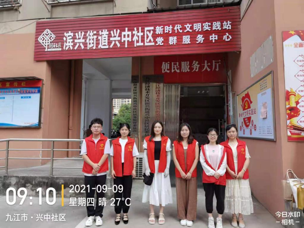 为深入推进党史学习教育,积极融入九江市创建文明城市大局,扎实开展“为群众办实事”活动,2021年9月9日,财税金融学院党员教师王子茹、何婧、汤敏、李雅琴,青年教师温平平、曹晗曦、刘鹏等一行到滨兴街道兴中社区开展志愿服务活动。