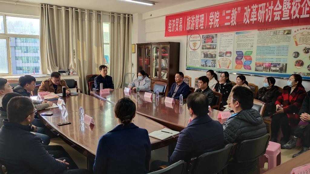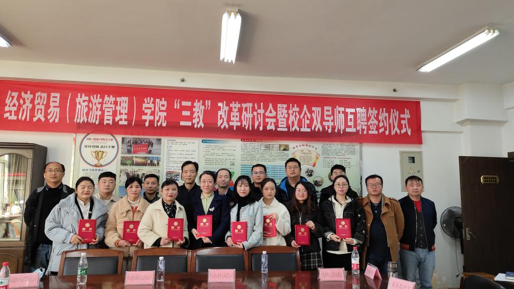 为深化教学改革,在教育部学徒制试点的基础上,拓展我院其他专业现代学徒制试点及校企互聘双导师教学团队建设,经济贸易学院于11月23日,在综合楼804举行“三教改革”系列活动暨校企互兼互聘仪式,经济贸易学院党政领导及相关教师、合作企业代表、兄弟院校代表参加了此次仪式。