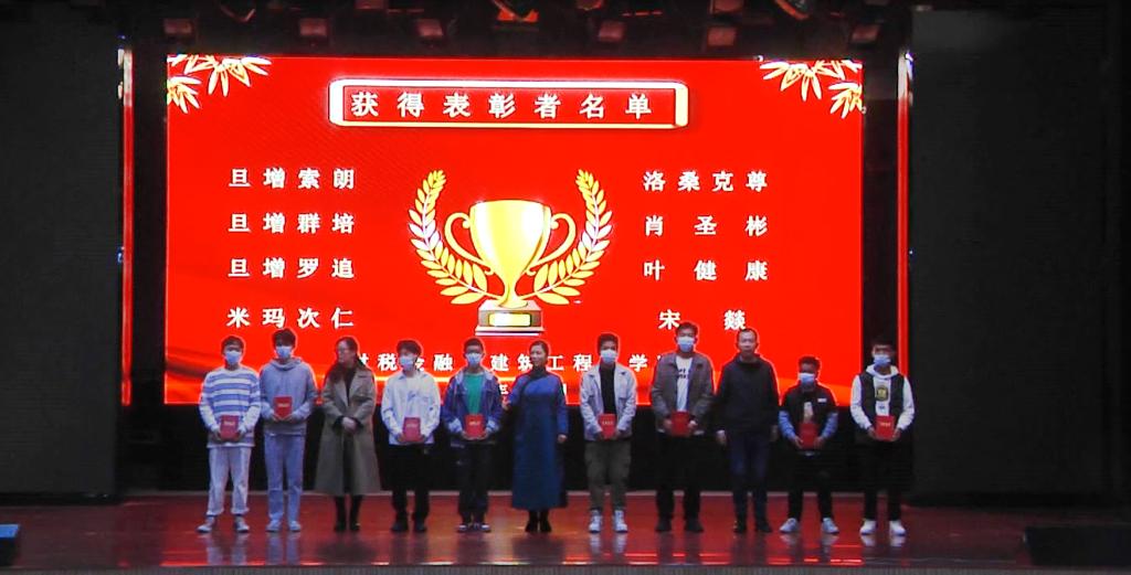2022年3月9日,财税金融(城乡建设)学院在校英才交流中心召开表彰大会,对文明校园建设中涌现出来的“救危扶困、关爱同学”的先进典型旦增索朗等8名同学进行了表彰。学院胡红霞书记、吕亨龙副院长、王怡然副书记出席会议并颁奖。