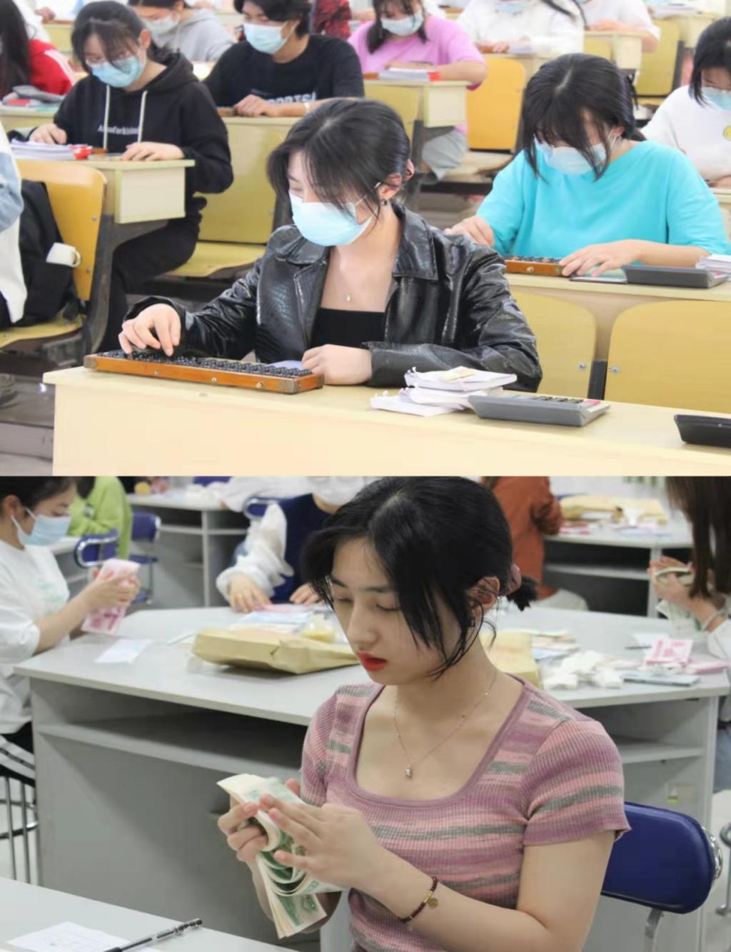 点钞技能是会计专业学生的一门特色专业课,此次点钞技能竞赛很好的检验了会计专业学生的专业技能素养。比赛要求同学们在五分钟之内对八把100、50、20、10的不同面值且不同数量的钞进行清点,比赛中,同学们用手按式多指多张、手持式多指多张等不同的方法完成了清点。