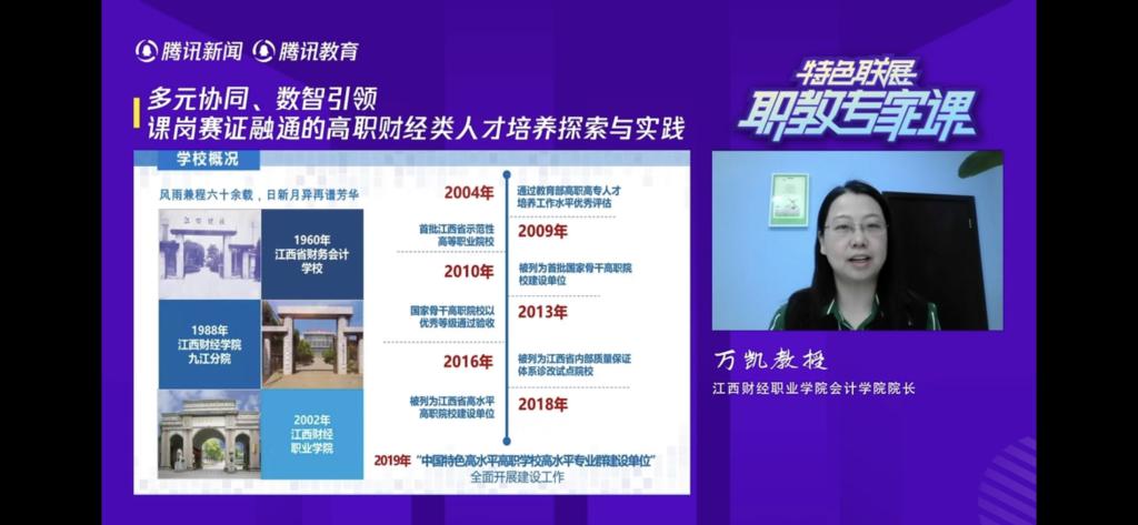 4月25日,会计学院院长万凯受邀参加腾讯新闻《职教专家课》直播讲座,讲座以《多元协同、数智引领、课岗赛证融通的高职财经类人才培养探索与实践》为主题,分享了我校职业教育改革成果与典型经验,介绍了学校概况及特色培育。整场课程直播的在线收看人数高达106万人次。