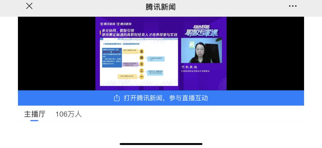 腾讯新闻是一线主流媒体,其新闻紧追时代热点,覆盖面广、传播速度快。通过万院长在腾讯直播间的分享,让全国各地100多万社会大众更好的了解了江西财经职业学院的办学理念和特色,对学校品牌建设起到了很好的推动作用。