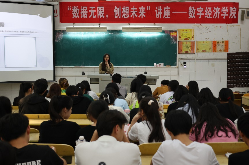 2022年5月23日下午,数字经济学院在教学楼107教室举办了“数据无限,创想未来”专题讲座。本次讲座的主讲人是九江浔音文化传媒有限公司副总经理、江西财经职业学院19届毕业生汪茜茜,数字经济学院党总支副书记龚威、商务数据分析与应用教研室教师及100余名学生参加了此次讲座。