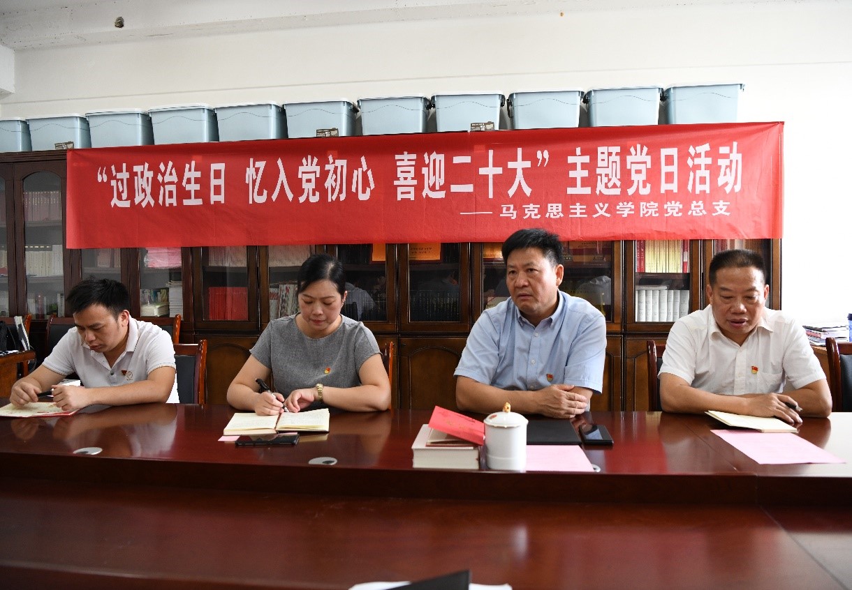 9月30日下午,马克思主义学院党总支在综合楼904举办了“过政治生日 忆入党初心 喜迎二十大”主题党日活动。校党委书记、校长刘彪文出席活动,马克思主义学院全体党员教师参加,会议由马克思主义学院党总支副书记、副院长熊晓兰主持。