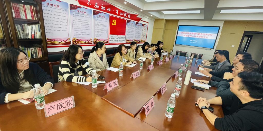 座谈会上,国际教育学院副院长杨瑞(主持工作)对来访客人表示热烈欢迎,对江西现代职业技术学院老师来传经送宝表示感谢,并希望双方深入交流,相互学习,共同提高。党总支书记王胜华介绍了国际教育学院的发展进程,重点介绍了近年来学院大学英语课程教学改革、专业建设、校企合作、第二课堂活动以及取得的成绩。何梅主任对我院在教学改革和专业建设方面取得的成果表示高度赞赏,并详细介绍了江西现代职业技术学院大学英语教学改革及取得的成果,特别是他们在全国职业院校教学能力竞赛和职业技能竞赛中取得的成绩和宝贵的参赛经验,让我们青年教师受益匪浅。随后,双方就课程建设、教学成果申报、教学能力竞赛、学生技能竞赛等方面进行了深入的交流与讨论。