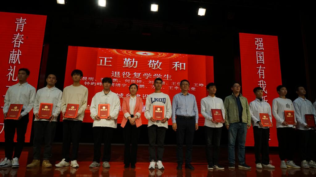 校党委委员刘锋、校招就处处长周剑等为城乡建设学院退役复学学生颁发了荣誉证书,表示了学院对退役复学学生的欢迎,同时也鼓励毕业生积极响应国家政策,参军入伍为国家建设奉献自己的青春力量。