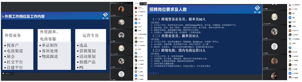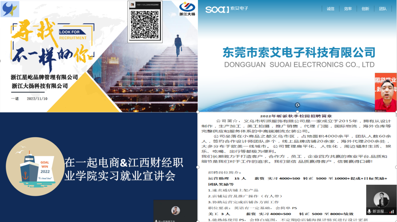 经过前期充分考察和全面沟通,国际教育学院充分利用校友及校企合作单位等资源,邀请了浙江星屹品牌管理有限公司、东莞在一起电子商务有限公司、东莞市索艾电子科技有限公司、义乌市昕派服饰有限公司四家企业进行线上企业招聘宣讲会。各企业负责人通过介绍企业文化、发展历程、行业发展前景、人才需求、薪酬福利、晋升渠道以及人才培养计划等内容来展现各自特色,从而匹配企业需求的人才资源。