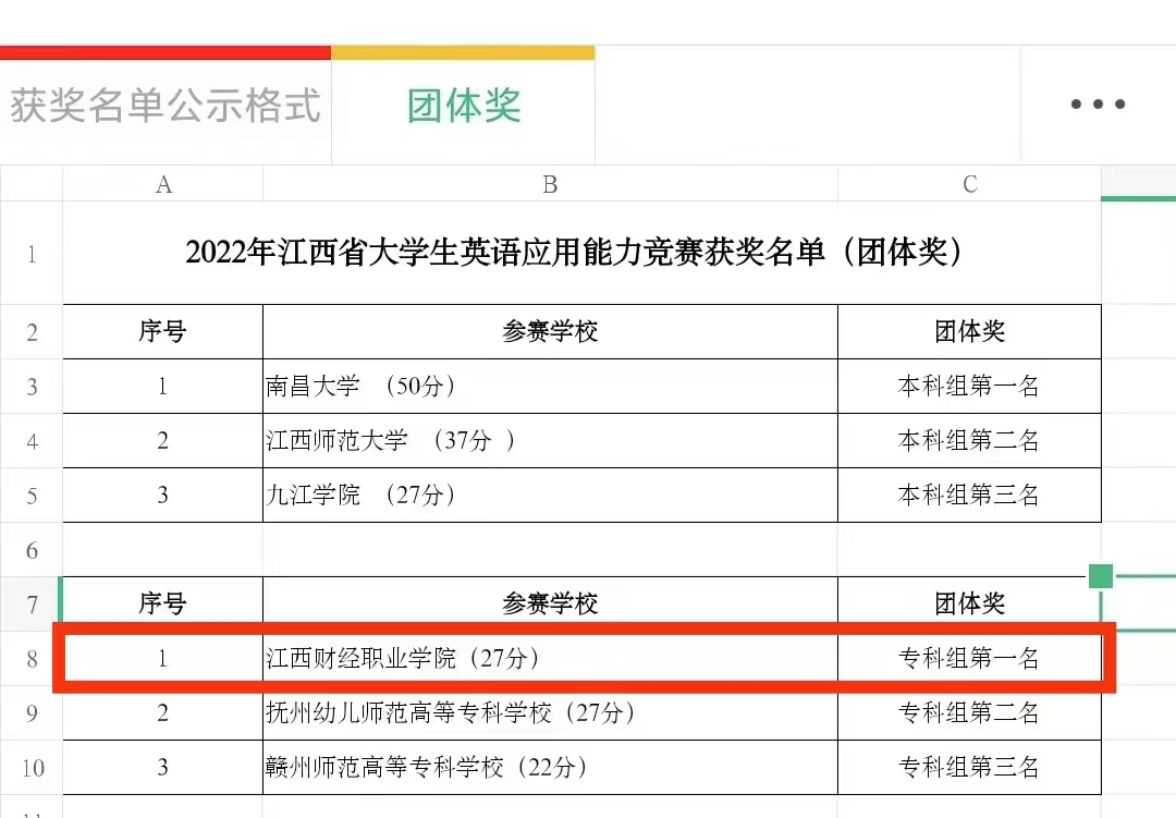 日前,省教育厅网站正式公布了2022年江西省大学生英语应用能力竞赛获奖名单。根据团体总分的积分规则,我校凭借一等奖2项,二等奖1项,三等奖1项的好成绩,共获得团体总分27分,位列全省专科组第一名。