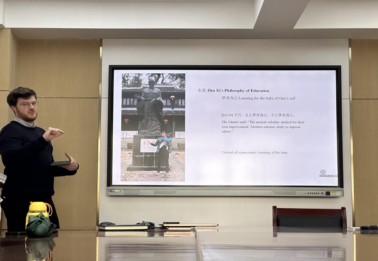 本次教研会邀请了我校来自加拿大的外籍教师Dallas担任主讲,他围绕以中西方文化和教育教学理念,结合自身经历,为教师们介绍了亚、欧、美文化和中西方教育教学理念,交流过程中,Dallas表达了对中华传统文化,尤其是对朱熹教育哲学思想的热爱。