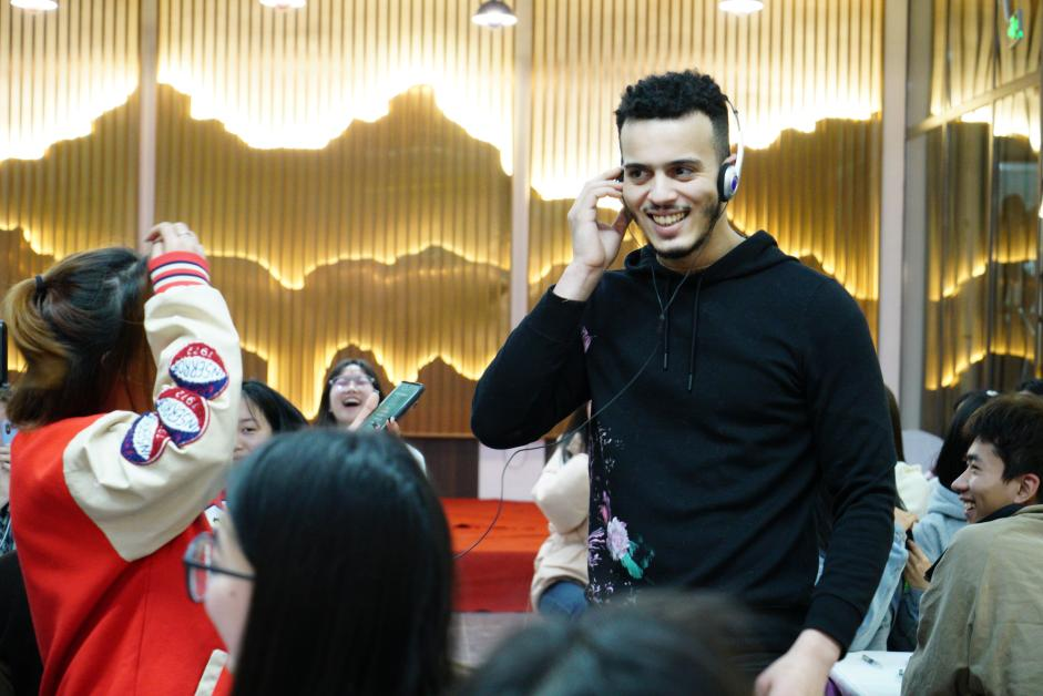 交流活动中场举行了精彩有趣的猜歌游戏:主持人邀请外国小伙伴们依次上场佩戴耳机,哼出耳机中播放中文歌的旋律,而现场的其他小伙伴则根据他们哼出的旋律来猜歌名,猜对歌名的伙伴可获得了神秘的盲盒礼物。现场热闹的氛围被推到了高潮。