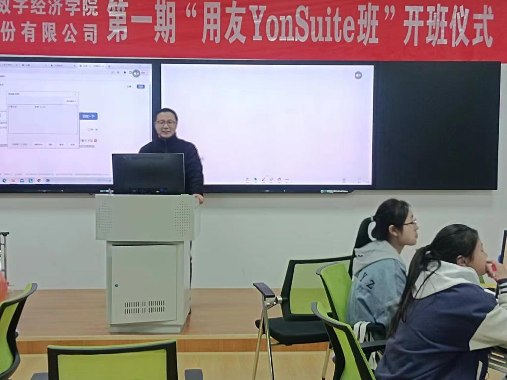 “用友YouSuite班”开设企业信息系统认知,供应链信息系统实施、管理信息系统客户化实施、实施方法论与项目综合实训、YonSuite云平台、YonSuite业财税档综合智能实训等8门课程,教学时长约11周,由用友公司北京总部桑大勇博士等企业专家来学校与我校教师共同授课。