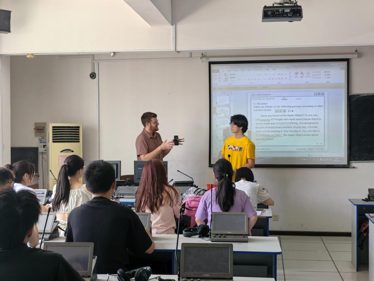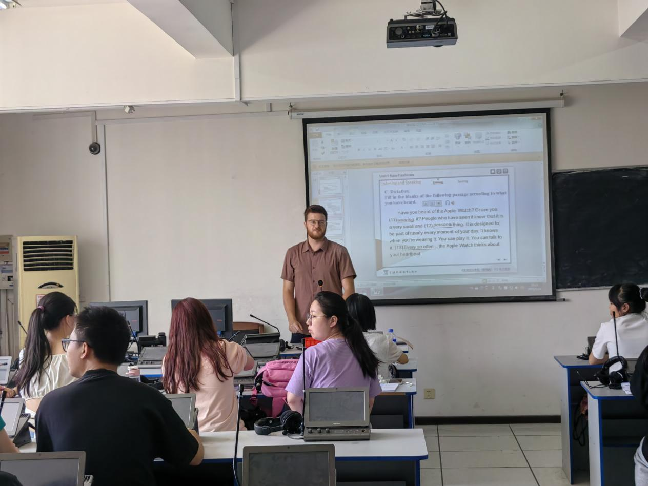 为进一步了解我校外籍教师的课堂教学情况,促进中外教学方法的沟通与交流,提升中外教师的课堂教学能力,5月31日上午,国际教育学院组织教师在综合楼410教室听了加拿大籍英语外教Dallas的《大学英语II》课程??翁蒙?,Dallas老师通过组织学生个人演讲、同学提问、分组讨论、小组汇报展示等方式精心设计教学过程。外教教态自然、教学目标明确,注意调动学生的积极性和主动性,时刻关注学生的教学反馈,通过丰富多彩的交流互动,提高了学生学习英语的热情,增强了学生开口说英语的自信心。