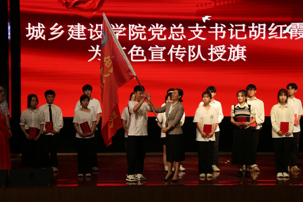 第二项议程为城乡建设学院党总支书记胡红霞为江西财经职业学院城乡建设学院红色文化宣传队授予队旗;