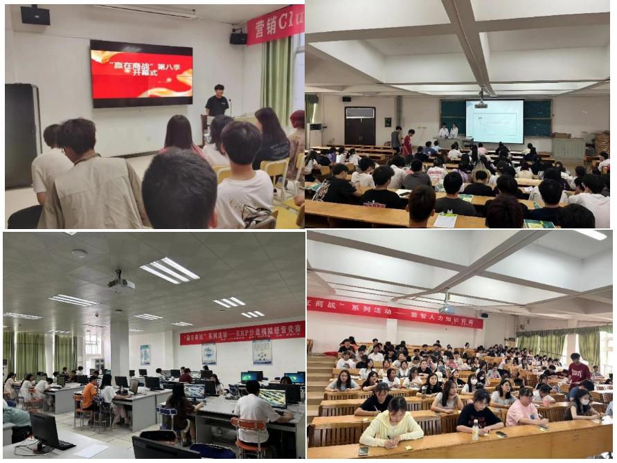 “赢在商战”系列活动由营销秀、ERP沙盘模拟经营竞赛、数智人力知识竞赛三个赛项及衍生项目“学长学姐聊职场”组成,旨在搭建学生技能竞赛、校企合作交流、教师教学研讨于一体的平台,促进“赛学一体、双堂融合、多元共育”的人才培养模式改革及以竞赛文化、社团文化、职场文化为内涵的专业群文化建设?!坝谏陶健钡诎思鞠盗谢疃牟呋?,通过海报,条幅,多媒体等多种形式的大力宣传,经过初赛、复赛、决赛三轮角逐,所有赛项圆满结束。