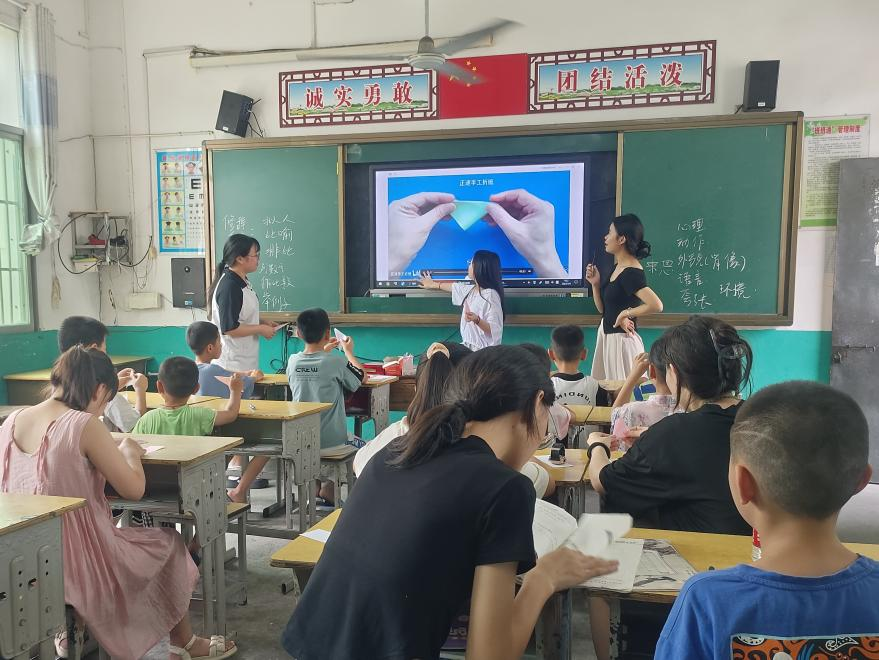 关注儿童成长,温暖儿童心灵。实践队在梅颜小学进行义务支教,通过语、数、英等基础课程教学,剪纸、音乐赏析等特色文化课程以及红色故事会、红歌大家唱等红色主题教育课程教学,寓教于乐,让孩子在学习知识,锻炼表达沟通能力、执行能力的同时,学习传承红色基因。在给孩子们进行丰富课堂教学之余,队员们“各显神通”,利用自己的特长,和小朋友们切磋羽毛球、乒乓球以及篮球等体育项目,挥洒汗水,肆意欢笑。本次实践队还特意为孩子们准备了书籍、字帖、羽毛球和篮球等文体用品,保障基本支教活动进行,让学生感受到社会温暖。