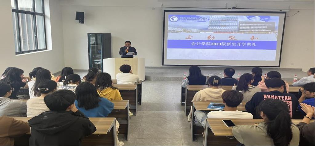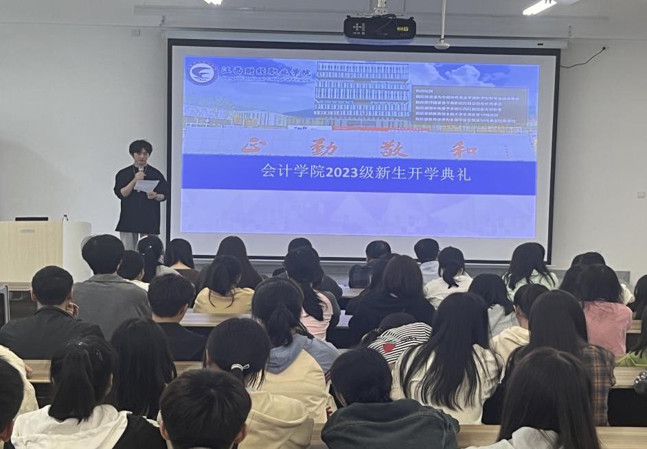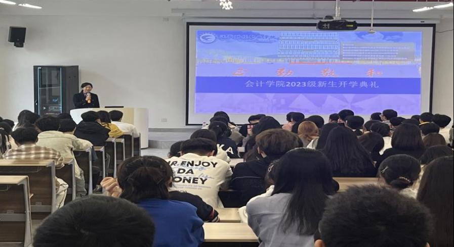2023年10月16日下午,我院在八里湖校区召开新生开学典礼暨入学教育大会,出席此次会议的领导及老师有会计学院党总支书记张家顺、会计学院副院长齐洁、会计学院党总支副书记杨燕、大数据与财务管理教研室主任肖铁锋老师、会计信息管理教研室主任余云宜老师等。参加此次会议的学生有2023级大数据与财务管理专业和会计信息管理专业的全体学生。