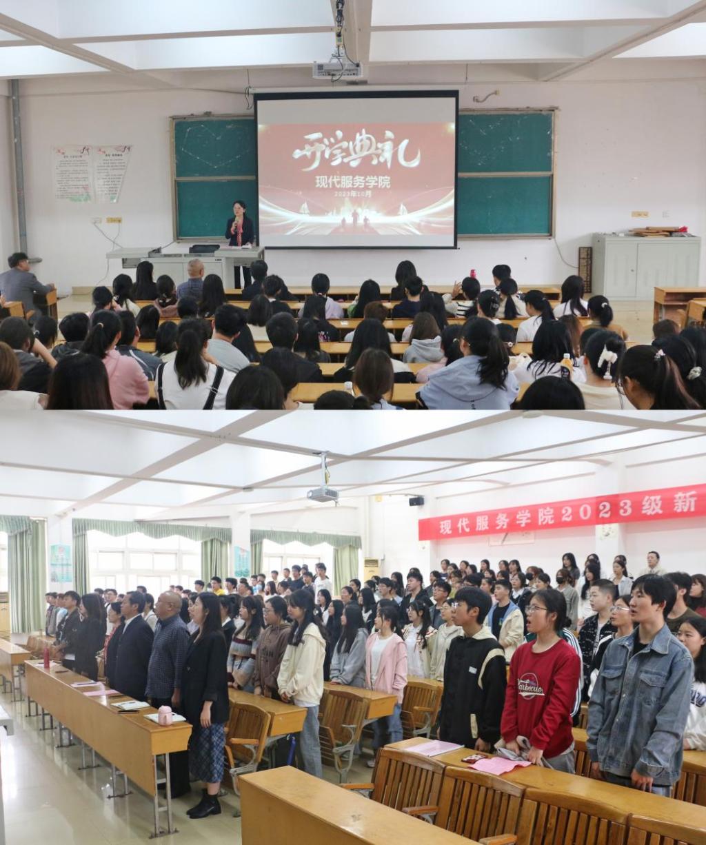2023年10月13日上午,现代服务学院2023级新生开学典礼在综合楼阶梯教室(六)成功举行。现代服务学院(本科部)党总支书记高小兰、副院长(主持工作)姜启跃、新生班班主任和学院其他教职员工以及2023级全体新生参加了开学典礼??У淅裼裳г喊旃抑魅沃苎墙鹬鞒?。