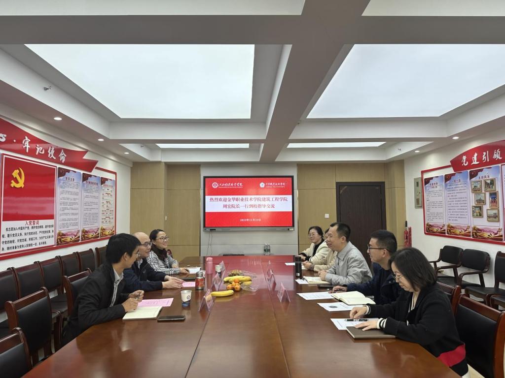 11月23日下午,金华职业技术学院建筑工程学院院长周宏、建筑工程学院工程造价专业副主任刘国平、建筑工程学院工程造价专业教师吴育萍一行来我校调研交专业建设相关工作。城乡建设学院副院长吕亨龙热情接待了周宏一行,双方在综合楼918会议室进行了座谈交流。城乡建设学院副院长张乐、工程管理教研室主任吴翠翠、建筑工程技术教研室主任郭发丽,骨干教师张丽雅等参加了交流座谈。