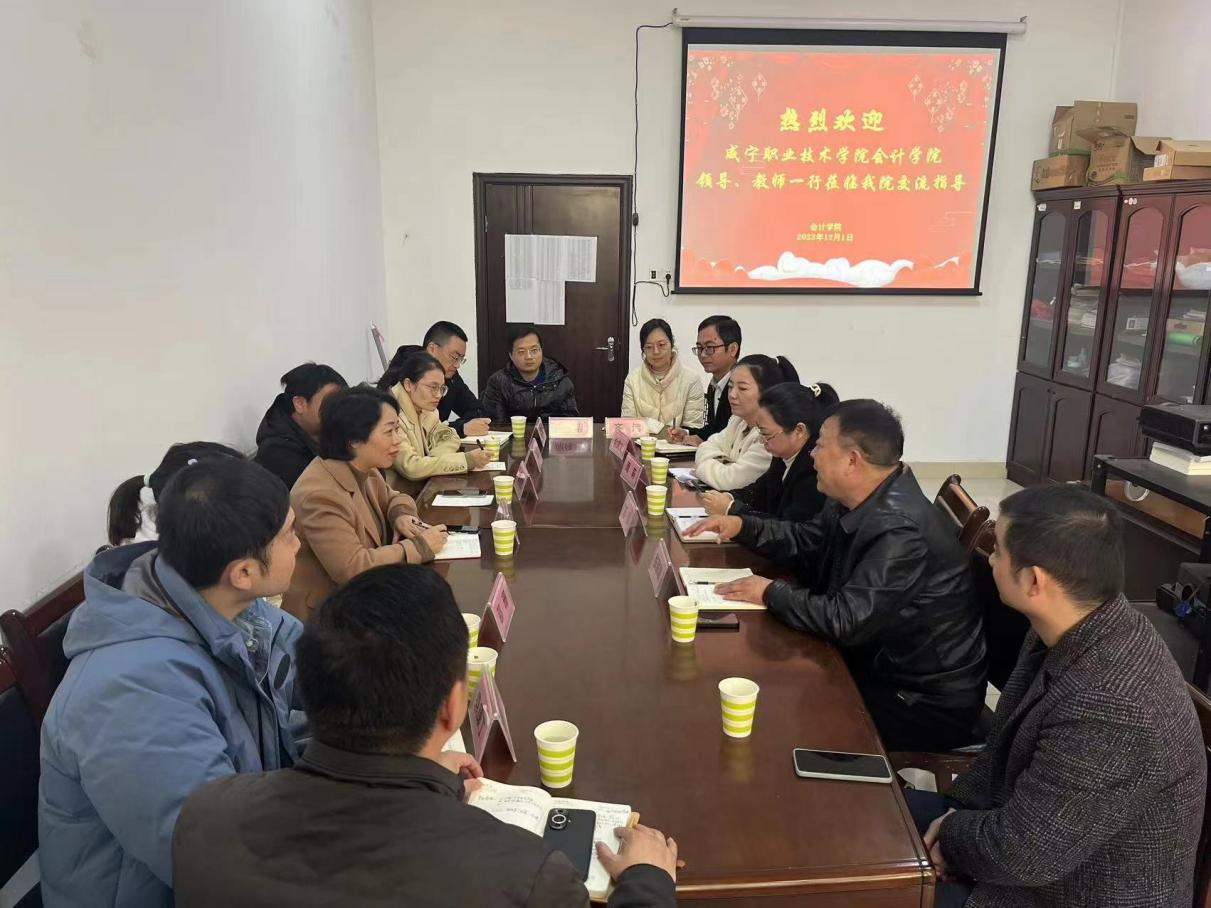 万院长、张书记对咸宁职业技术学院会计学院领导老师们的到来表示热烈欢迎,并就我校发展历程、国家“双高”专业群建设、会计实务技能竞赛备赛、师资培养、学生管理等方面进行了细致介绍。万院长认为,两院在发展历程、专业建设等方面有许多相似之处,借此次交流之机,在国家大力发展职业教育政策背景下,两院可以互相学习,相互借鉴,共同探讨大数据技术下专业改革的发展之路,为培养高素质技能人才献力献策。