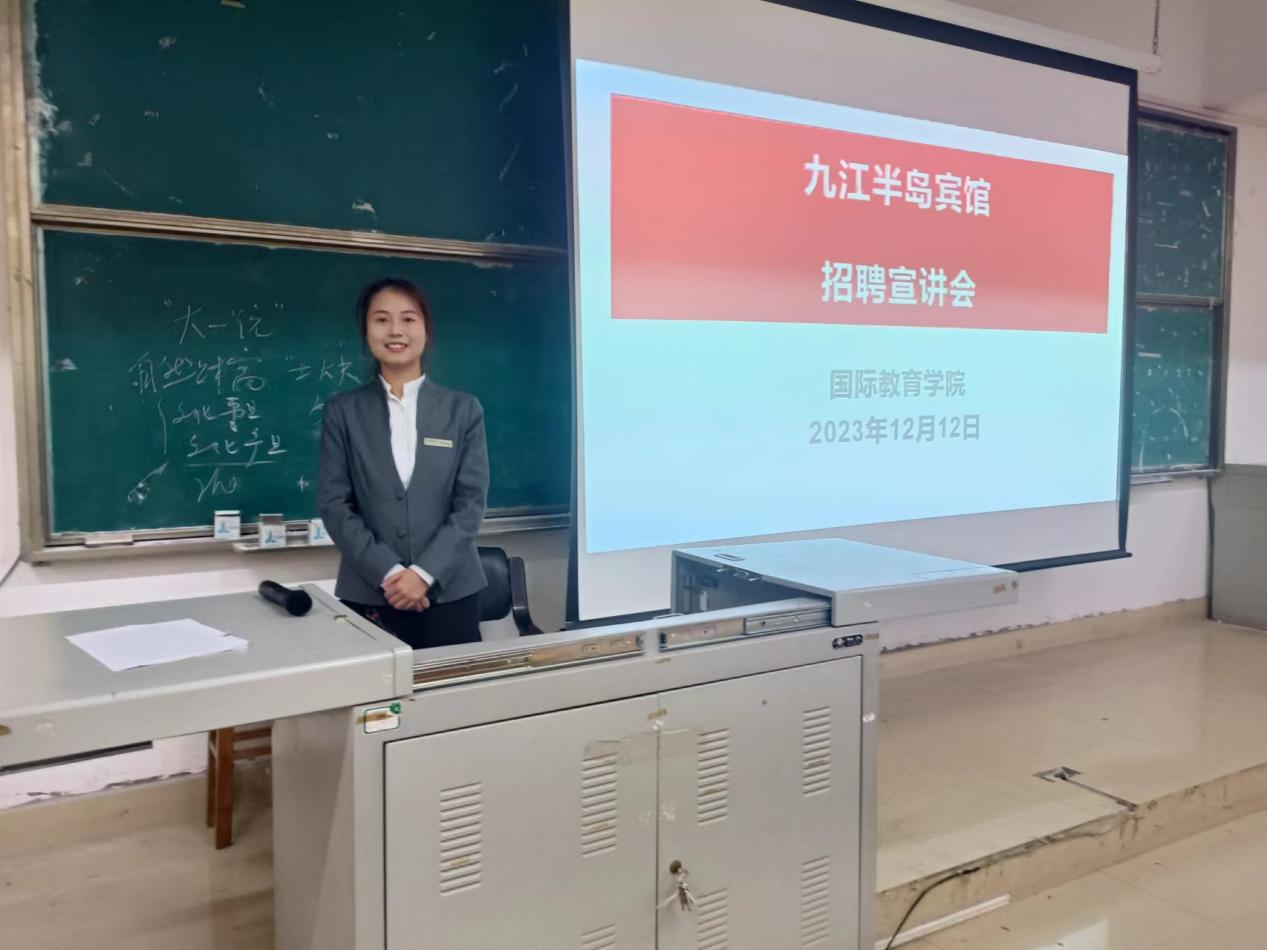 本次招聘宣讲会邀请了江西数字引力企业孵化器有限公司、九江半岛宾馆、昆山华泛信息服务有限公司三家企业,各企业负责人分别从企业概况、招聘岗位及职责、培训与晋升机制、薪资待遇等方面向同学们进行详细的介绍,并为毕业生提供了外贸订单员、外贸运营业务员、跨境电商商务助理、商务接待等岗位50多个。