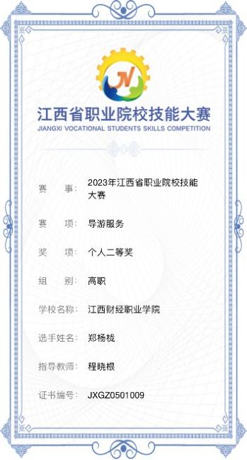 近日,江西省职业院校技能大赛高职组“导游服务”赛项在江西旅游商贸职业学院落下帷幕。本次大赛由省教育厅主办,江西旅游商贸职业学院承办,来自全省的18支参赛队32名选手同台竞技。经过全天紧张激烈的角逐,由我校文化旅游学院程晓根老师指导,郑杨栊、黄婷玉两位同学组成的代表队取得优异成绩,荣获个人二、三等奖。