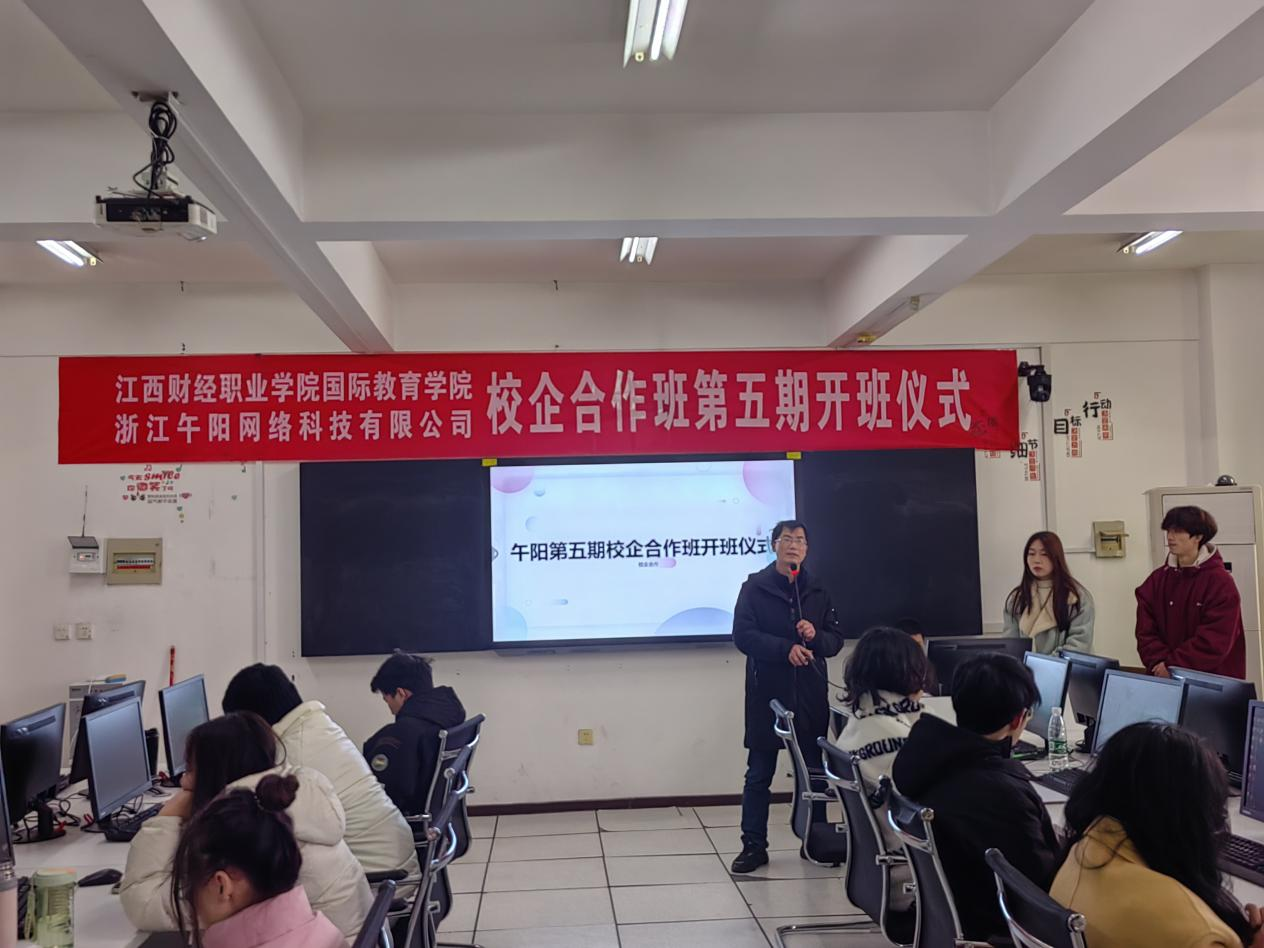 2月28日下午,国际教育学院与浙江午阳网络科技有限公司合作开设的跨境电商班第五期开班仪式在综合楼401教室举行,浙江午阳网络科技有限公司市场部主管谢芳林,企业讲师刘光宇、何懿洁,国际教育学院党政班子、商务英语教研室主任和合作班全体同参加了开班仪式。
