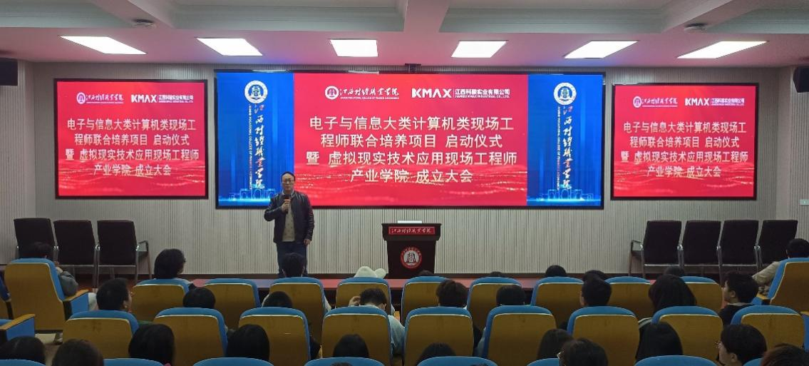 2023年10月27日晚,信息工程学院联合江西科骏实业有限公司在综合楼7楼报告厅召开现场工程师联合培养项目启动仪式暨虚拟现实技术应用现场工程师产业学院成立大会。信息工程学院院长易文泉、副院长彭健、科骏公司相关人员以及虚拟现实技术应用等相关专业师生参加仪式。