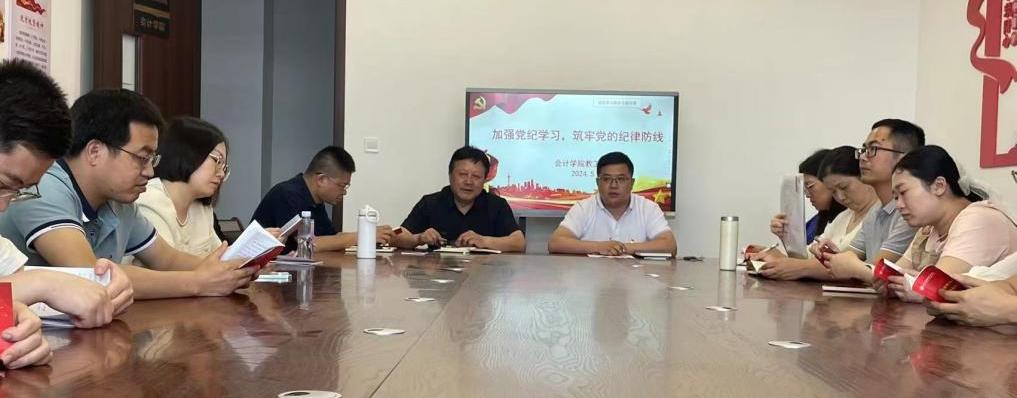为贯彻落实江西财经职业学院委员会印发《关于在全校开展党纪学习教育的实施方案》的通知精神,扎实开展党纪学习教育,会计学院教工党支部于5月21日下午在一教B308室召开党纪学习教育专题党课——《加强党纪学习,筑牢党的纪律防线》,党课由教工支部书记杨燕授课,党总支书记张家顺主持,全体党员教师参加。