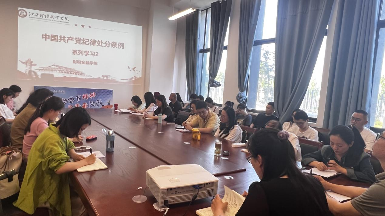 为深入贯彻落实全面从严治党要求,加强教职工的纪律意识和规矩意识,5月28日下午,财税金融学院在八里湖校区洙泗学馆B101会议室召开了《中国共产党纪律处分条例》系列学习会第二场,学院全体教职工参加了此次学习。