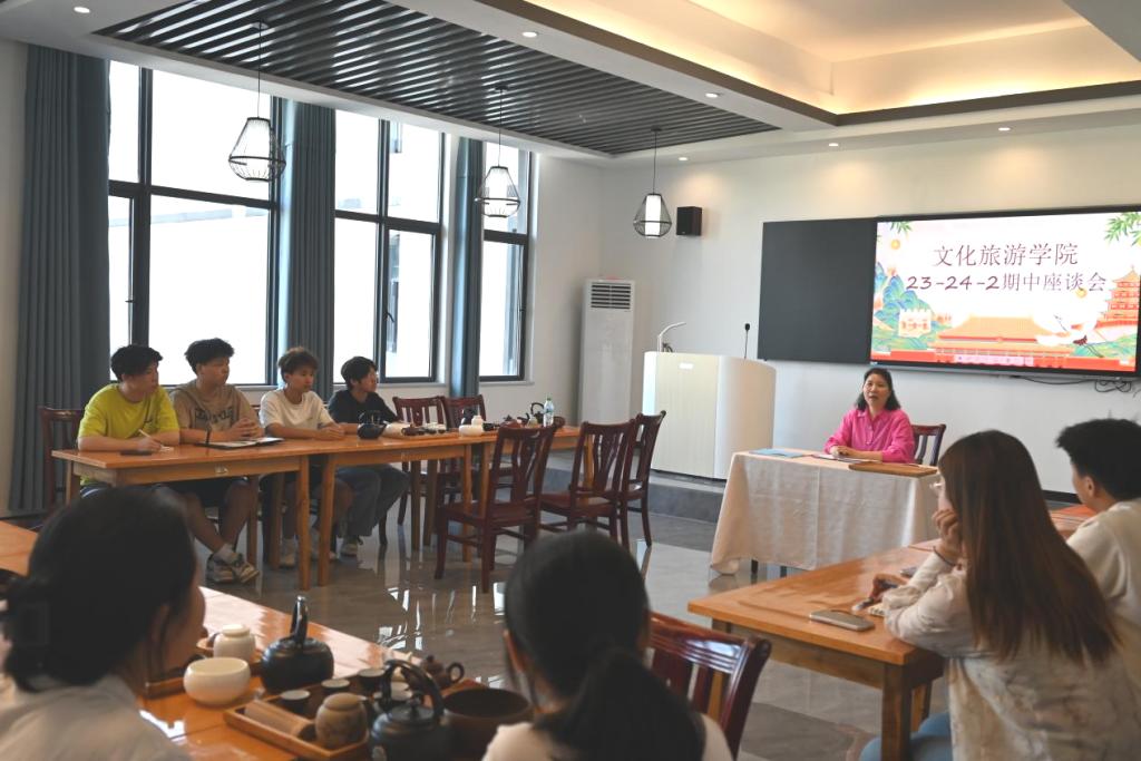 为进一步加强教学管理,了解本学期学生在教学运行及管理方面的建议和需求,共同促进教学质量提升,5月28日下午,文化旅游学院在八里湖校区白鹿学馆C404茶艺实训室开展2024春季学期期中座谈会,座谈由文化旅游学院负责人易娇艳主持,22、23级各班学生代表参会。