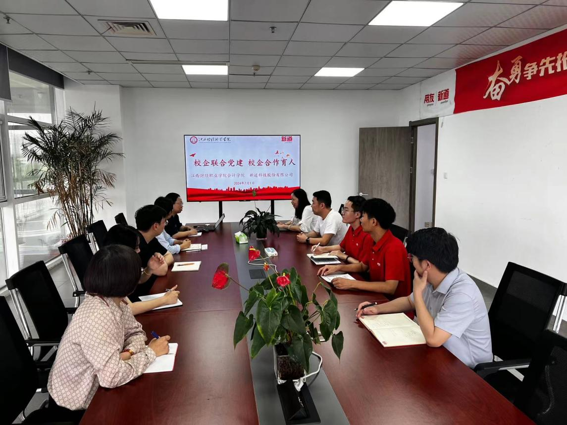 为贯彻党的二十大精神,落实习近平总书记关于教育的重要论述,加深“现场工程师”的校企合作育人成效,会计学院依托“廉洁化人、立德树人”党建品牌打造,联合新道科技股份有限公司,充分发挥学院教师及企业导师党员的先锋模范作用,在7月1日庆祝中国共产党成立103周年之际,于用友产业园(南昌)开展“校企联合党建,校企合作育人”主题党建活动?;峒蒲г涸撼ね蚩鞒只疃?,新道科技股份有限公司华东区总经理丁立波以及公司导师党员代表王文江、彭佳琦、熊梅、熊志忠,会计学院副院长齐洁,教师党员代表宋振宇、曾越,“现场工程师”学生党员代表肖雲天、陈华参加活动。