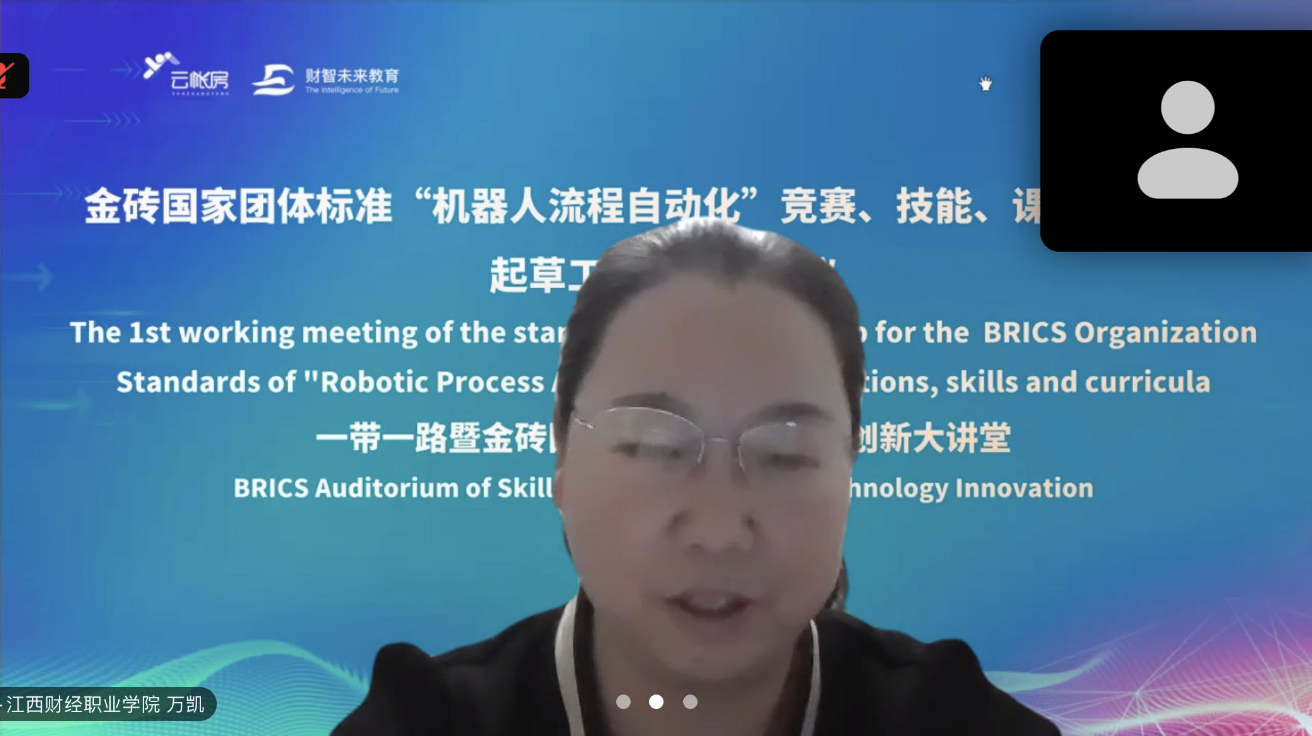 会计学院院长万凯作为标准起草主牵头单位代表发言。她表示,随着科技的飞速发展,机器人流程自动化已成为众多行业转型升级的关键技术。金砖国家作为新兴市场和发展中国家的代表,加强在此领域的合作不仅有助于提升各国的技术实力,更能为全球的经济发展注入新的活力。因此,制定统一的竞赛、技能、课程标准显得尤为重要。她还就如何推动标准的制定工作提出了具体的建议和措施。